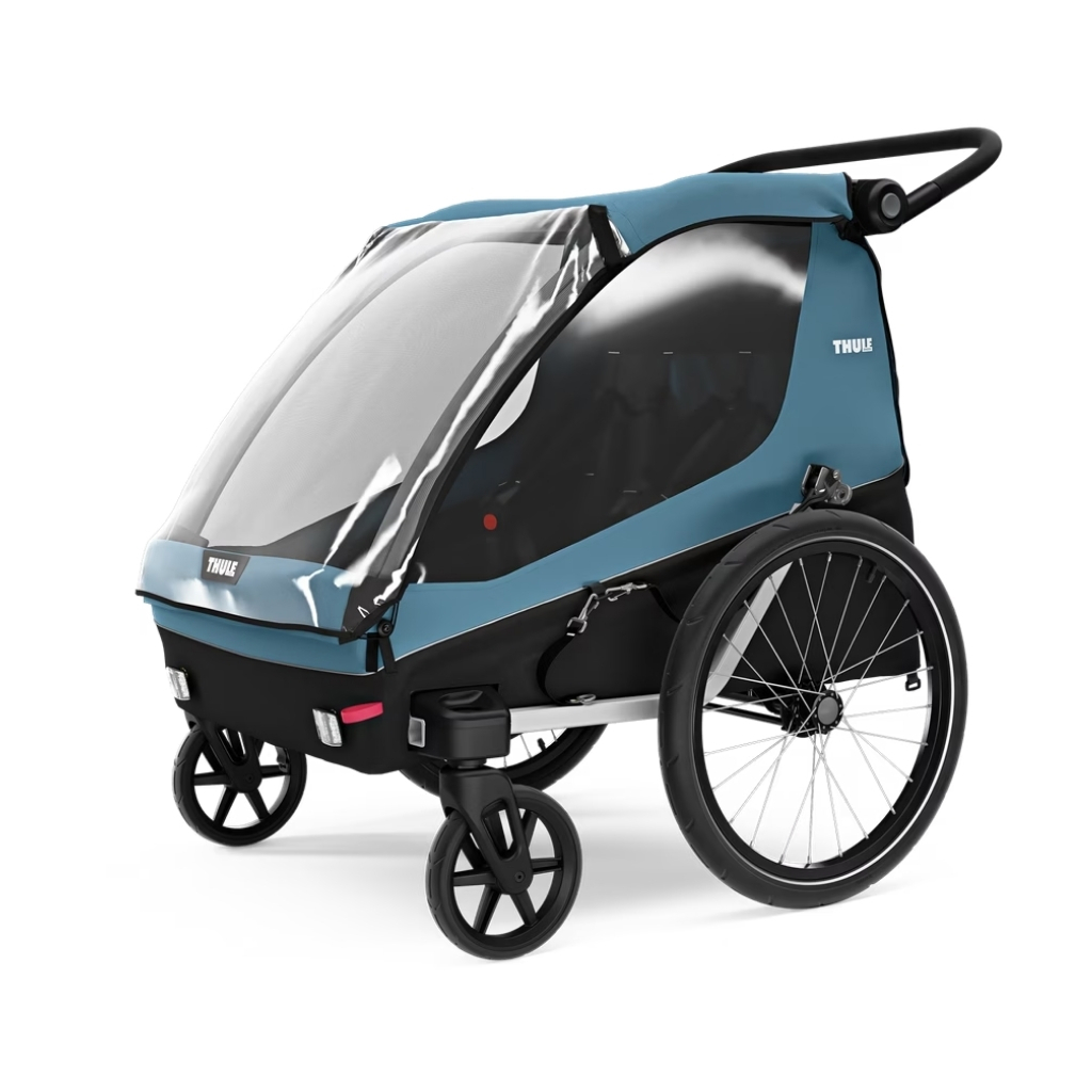 Transporte a bagagem da sua família e seus equipamentos para qualquer destino com o Thule Courier – um bike trailer seguro e confortável para até duas crianças.