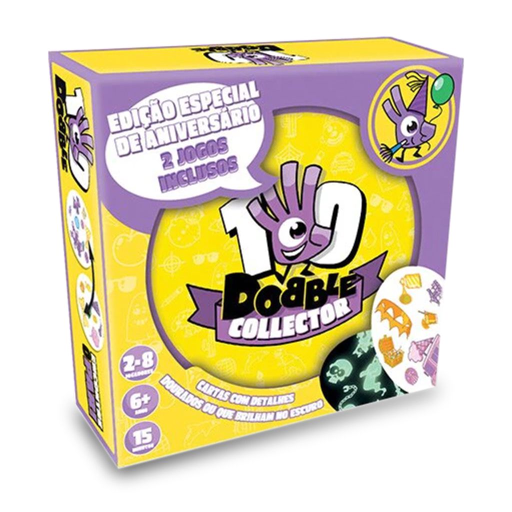 Essa edição de colecionador é uma verdadeira festa aos 10 anos de lançamento do primeiro Dobble! E não poderia ser uma comemoração qualquer, por isso, ele conta com 2 baralhos compostos por 55 cartas com os temas Festa e Festa Horripilante!