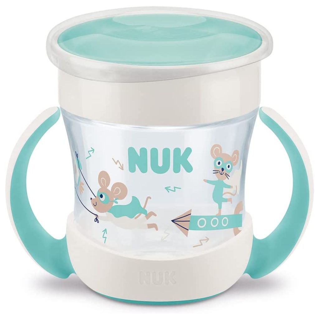 O copo NUK Evolution Magic Cup incentiva o desenvolvimento das habilidades motoras ao permitir a ingestão de líquido por toda a borda sem esforço e sem derramar, possibilitando à criança o uso de um copo semelhante ao utilizado pelos seus pais e com a segurança de não se sujar ou quebrá-lo, além de possuir uma eficaz estrutura antivazamento.