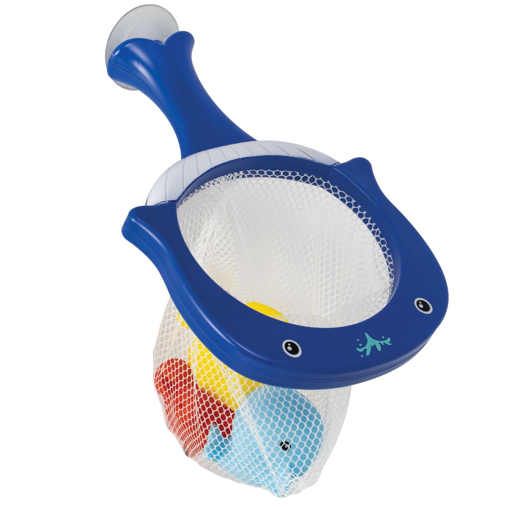 A rede baleia tem uma ventosa possibilitando a fixação em azulejos e vidros, os pequenos vão adorar brincas de arremessar.